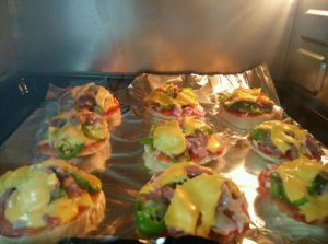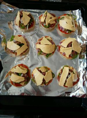 先抹一层番茄酱,之后放芝士碎,然后把切好的各种丁摆好,最上层再放上芝士片,放入烤箱烤二十分钟左右