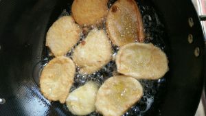 1.把裹上蛋液的馒头放入油锅里炸。 2.然后不停的两面翻,以免炸糊了。