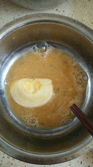 1.把馒头放入鸡蛋液里,两面抹匀。