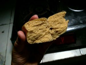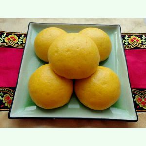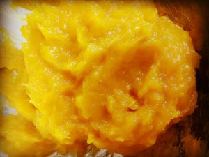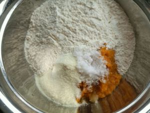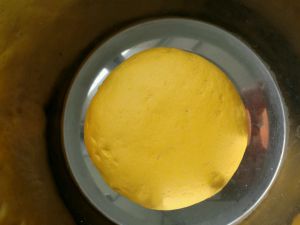 南瓜泥温度不烫手的时候先把酵母和南瓜混合,使酵母充分融化,然后再放入奶粉,白糖和面粉。