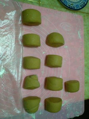 备用面团中取约0.5克加入少许抹茶粉,揉成绿色,擀面杖擀平后,用小刀切出1cm长度的条状,这是胡萝卜的叶子。