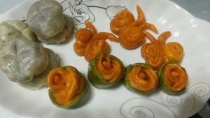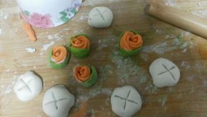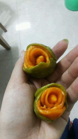 漂亮的玫瑰馒头,胡萝卜和菠菜的