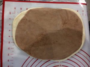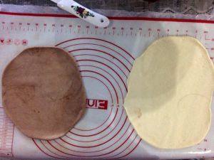 一份里揉入可可粉 揉均匀 然后把两个面团擀开