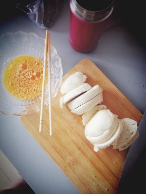 每次必嘱咐,一定要在切东西的同时就要加热锅烧上油哈,这样对上班族来说比较节约时间啊。馒头切片,鸡蛋打碎加点盐稍微加一点水(我也说不上来为什么,就是喜欢打鸡蛋的时候加点水,吼吼......)