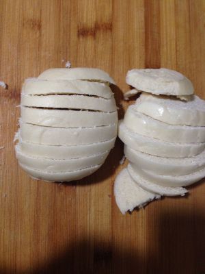 首先把放了几天的馒头切片~我比较喜欢吃北方这种馒头,没有放糖,有馍香。
