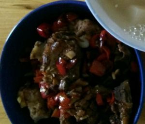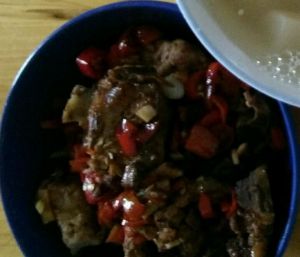 排骨先用水煮3-4分钟,土豆切成片,超市买的佐料用半包,辣椒5条,姜,蒜,适量,洋葱半个,差不多都可以了