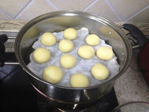 把面团揉成圆形,放蒸锅中二发,半个小时,然后大火蒸,水开后转中火,大概10来分钟就蒸好了,这个时候不要开盖,焖5分钟样子