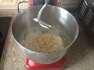 放入厨师机,放入酵母和白砂糖,再放入110ml牛奶,搅拌过程中发现液体量少了,再分次少量的添加牛奶