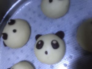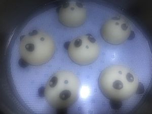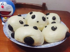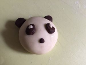 黑色的面团做眼睛、鼻子、耳朵,白色的面做点缀做眼珠子。