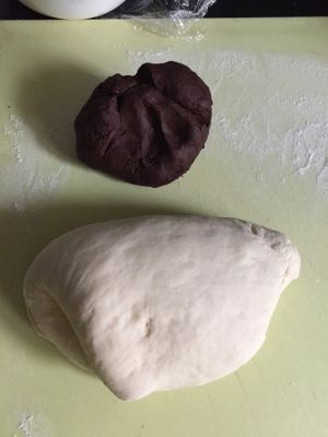 132克温水,加入发酵粉,搅拌均匀,静置七八分钟激活酵母。230克面粉,115克酵母水,揉成白面团。30克面粉混合5克可可粉,加17克酵母水。都是2:1就对了,没有电子秤的话,两碗面粉就是一碗水。面团揉好以后放到温暖处发到两三倍大小,手指戳个洞不塌陷不回缩就是好了。现在天冷,我一般是在锅里烧温水,摸着不烫手的程度,千万不能烫会把酵母烫死就发酵不起来了。把面团放在小点的容器里,盖上干净的湿布或者保鲜膜发酵即可。