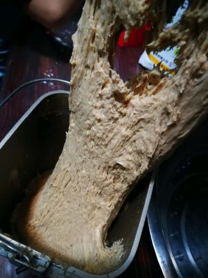 酵母用温水搅融, 糖也用温水搅融, 水分3次加入到面粉,