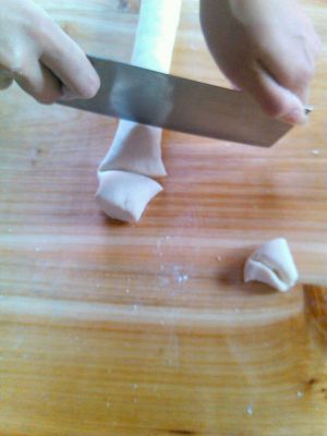用刀均匀的切开 切的时候要快 准 这样蒸出来的馒头才会漂亮好看