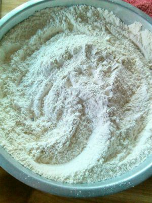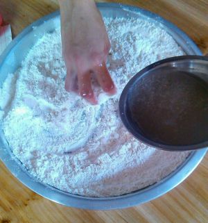 将面粉 泡打粉倒入面盆中 面粉和泡打粉要均匀的拌在一起