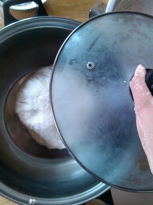 揉好的面团盖上盖子发酵 也可以用保鲜膜盖上 (冬天发酵大概要1-2个小时 夏天温度比较高发酵30-40分钟)待面团发酵到原来1-2左右就可以了