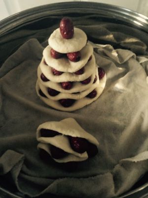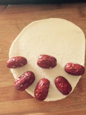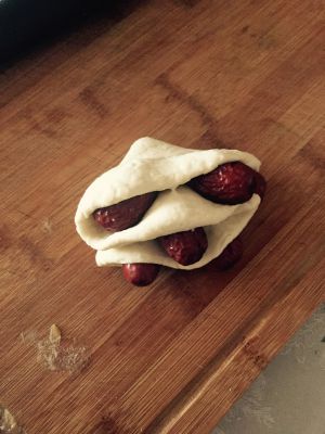 最后对折的同时在两层中间再加一个枣为了分开面皮,也比较好看。