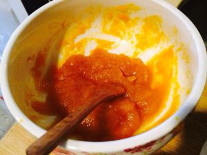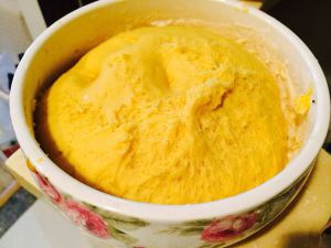 将糖、小麦粉、酵母粉、南瓜一起搅拌均匀