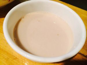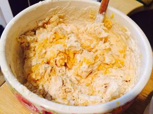 酵母放入温水里化开,将300克面粉和其他东西(除油外)倒在一个容器里,将水一点点倒入容器里,用筷子不停扒动,直至所有水倒完,面成絮状,再淋入食用油