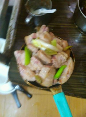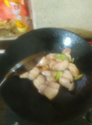 下五花肉加葱,泡椒酱油炒上色