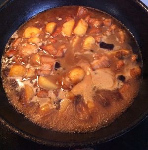 锅烧热后下洋葱炒香,加入裹上淀粉的猪肉翻炒一下,不用等全部变色下土豆一起翻炒,等肉炒到大部分变色少部分还能看到肉色的时候加没过土豆的水。