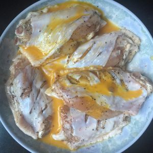 腌制好的鸡翅,控干水分,打入一个蛋黄,抓拌均匀。