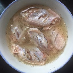鸡翅加1茶匙盐和1/2茶匙胡椒粉抓腌一会入味