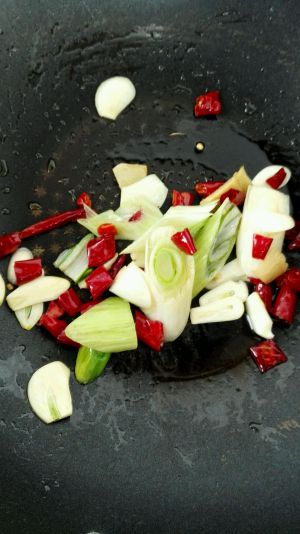 再下入干辣椒段儿,爆炒至辣椒呈枣红色