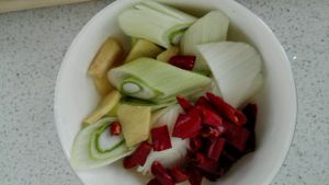 现在我们来准备配料:葱姜蒜切块备用,也可以根据自己口味准备点其他配料