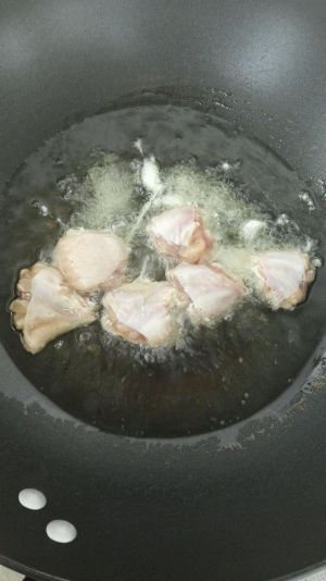 锅内上油,,烧制七成热时候迅速一个个把鸡翅下入锅,用筷子搅一下,以免煳锅