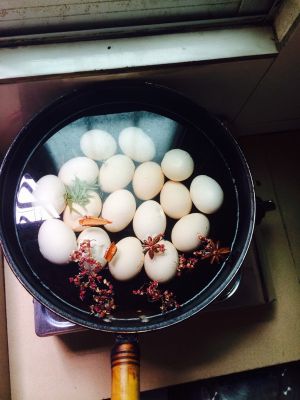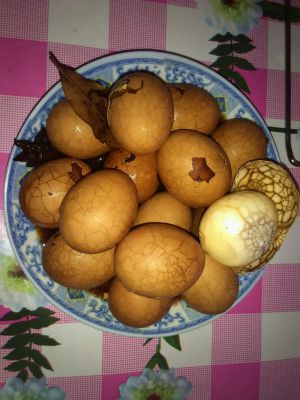 在头先煮鸡蛋的水里放入茶叶,八角,香叶,桂皮大火煮滚。将敲好的鸡蛋放在茶叶中加盐,糖 调味小火煮30分钟即可。