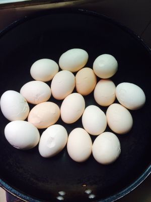 将准备好的茶叶【最好用红茶叶】、八角、冰糖放入沸水中,水量为刚好淹没鸡蛋为佳。