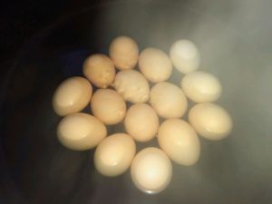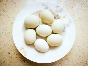 等到温热,把水倒掉,将鸡蛋一个个敲开。