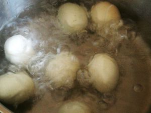 将敲好的鸡蛋放入锅中煮,转小火,煮一小时左右,中间要翻几次身。