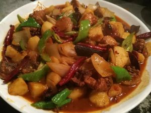 大火烧开转中火20分钟,加土豆后中火15分钟(熟了即可)在放下土豆后的十分钟下洋葱。之后下青红椒翻炒,放盐,鸡精。收点汁,即可出锅。
