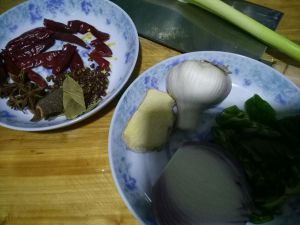 鸡肉或鸡腿肉用开水焯2分钟去血沫,切葱花、姜片、干椒段。