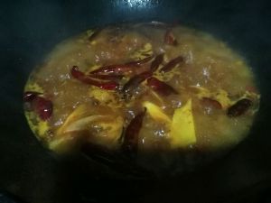 待鸡块变黄后加开水,要没过鸡块。加八角花椒干红椒茴香。盖锅换小火炖半小时。