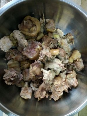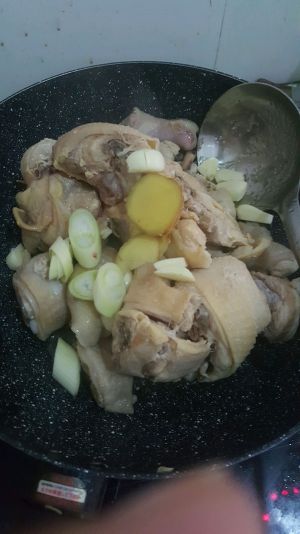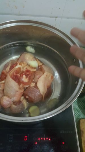 鸡肉切小块焯水,热水洗净备用。我用的是农家大公鸡。