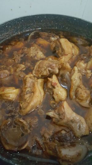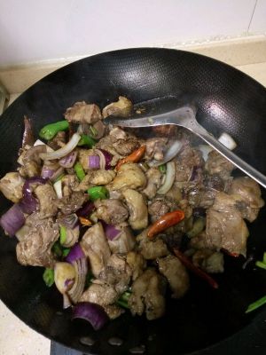 滴一几滴白醋去腥,加生抽,豆瓣酱继续翻炒。然后加开水,土豆块,加盖中火闷煮15 分钟后,加青椒片,大葱焖炒3_5分钟,出锅!