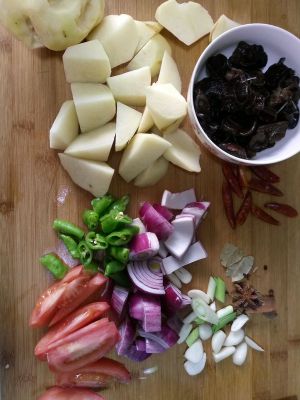 如图材料准备好,洋葱土豆青椒西红柿切块。准备八角,香叶,茴香,桂皮,花椒若干,干辣椒根据口味放几个,木耳泡发一小碗。