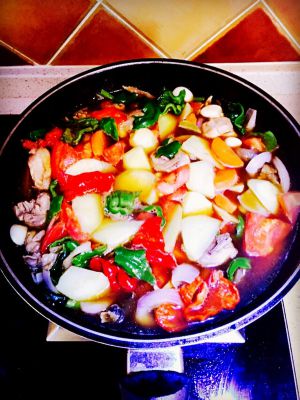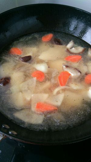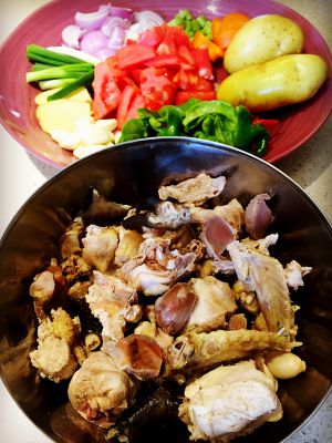 锅开十分钟后,加入炒好的鸡块继续煮。