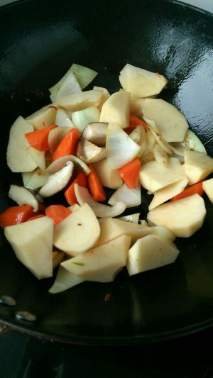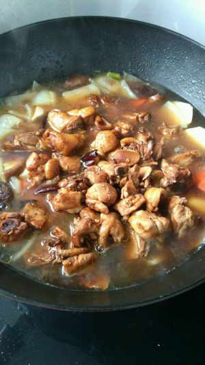 待鸡肉五成熟时倒入土豆和适量老抽继续翻炒(若用的是土鸡,此步骤中的土豆可以后放以免过于软烂)。