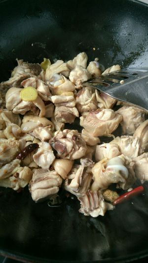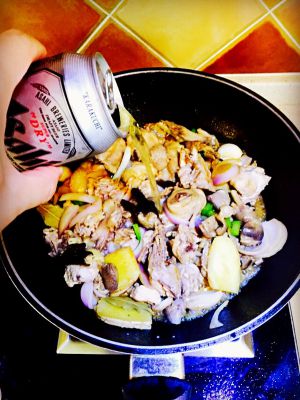 小料爆香 入鸡块翻炒 加啤酒 水 生抽 糖