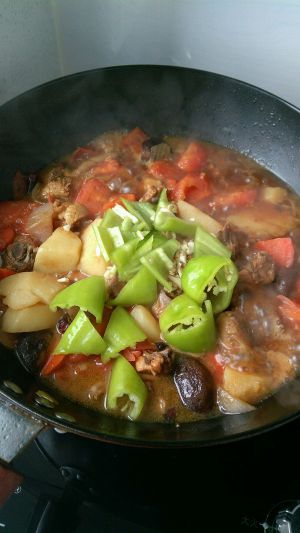 翻炒均匀后倒入一听青啤至没过鸡肉的量即可,不要盖盖适量翻炒焖锅,待收汁到一半时加入青椒。