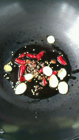 热锅凉油下入姜片、花椒、大料、干红辣椒煸香。