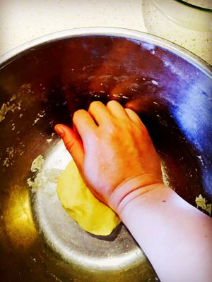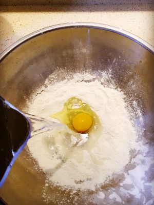 同时开始和面 高筋面粉 打入一鸡蛋 加凉水
