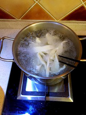鸡腿切块焯水。(在焯鸡块时,要加料酒和姜片去腥)