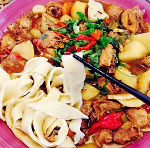 鸡腿滚刀切块,土豆切块,青椒切段,姜切片两片、切丝少量,蒜切片,干辣椒切段备用。