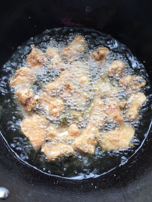 油放入锅内烧到七成热后,依次放入鲤鱼块,小火慢炸到金黄,捞出过滤油后再装盘。