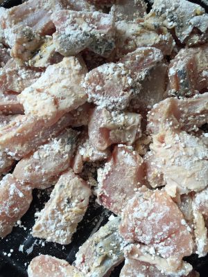 面粉和地瓜粉1:1混合后,几小时后把鱼块取出来,依次沾些混合好的粉装盘。