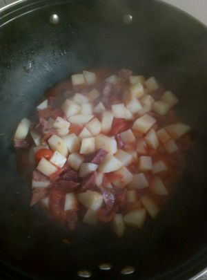 倒入番茄块,加两勺番茄酱,继续翻炒,然后加入适量清水,闷煮八分钟左右。