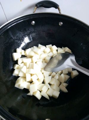 锅热以后倒入适量食用油,倒入土豆块,翻炒几下。